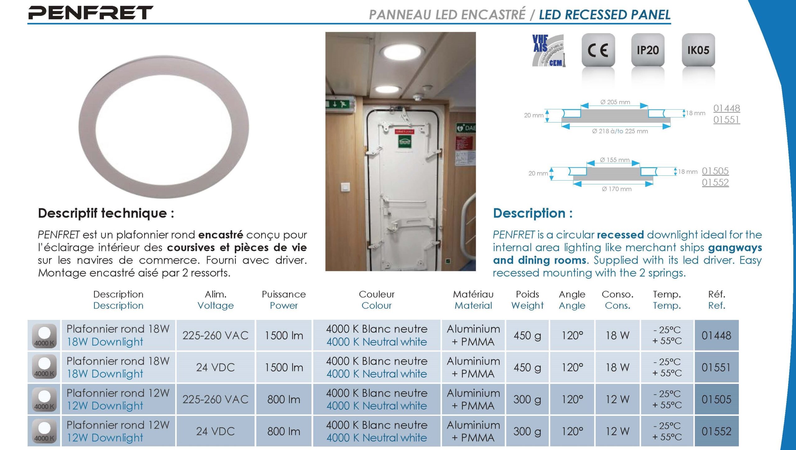 01552 – PENFRET – 800 LUMEN – NEUTRAL WHITE – Ø170MM (6.6IN) – 24 VDC